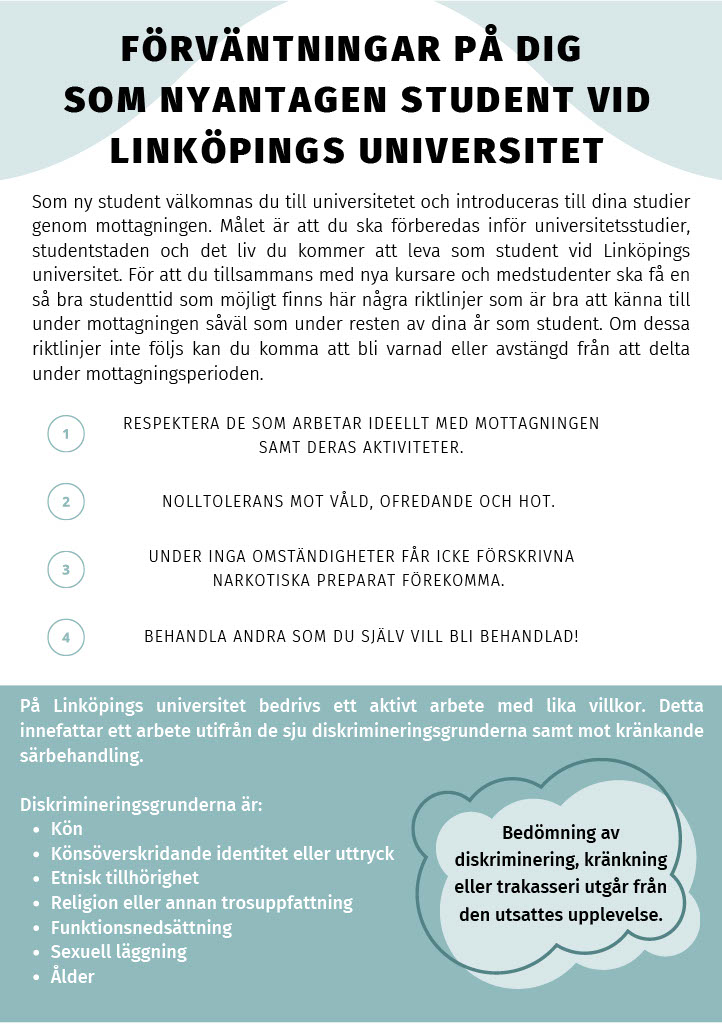 Det första Nollan ska göra är att tacka ja till sin plats. Detta kan göras på antagning.se. När Nollan har fått sitt antagningsbesked kan Nollan aktivera sitt LiU-ID. Detta görs på minit.liu.se/activation.